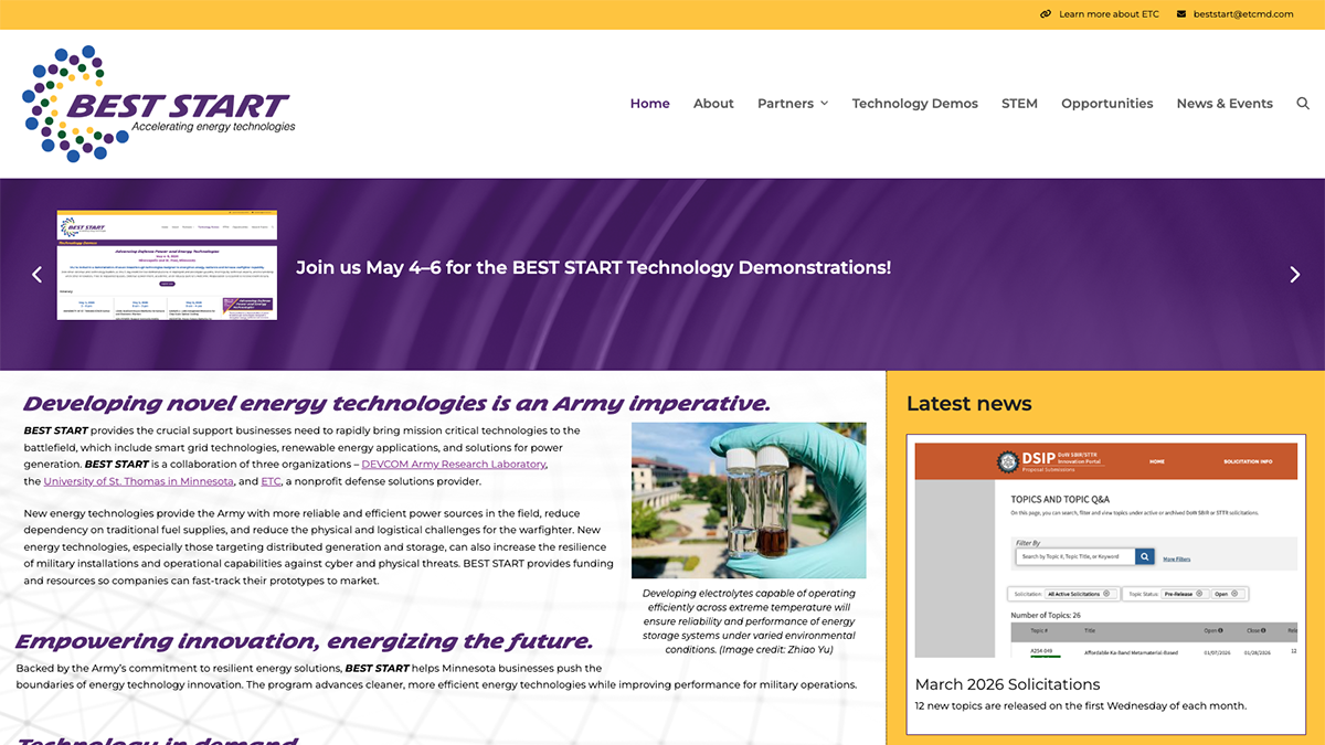 BEST START advances innovative technologies with the potential to drive the future of sustainable energy. BEST START prioritizes promising technology with battlefield application.