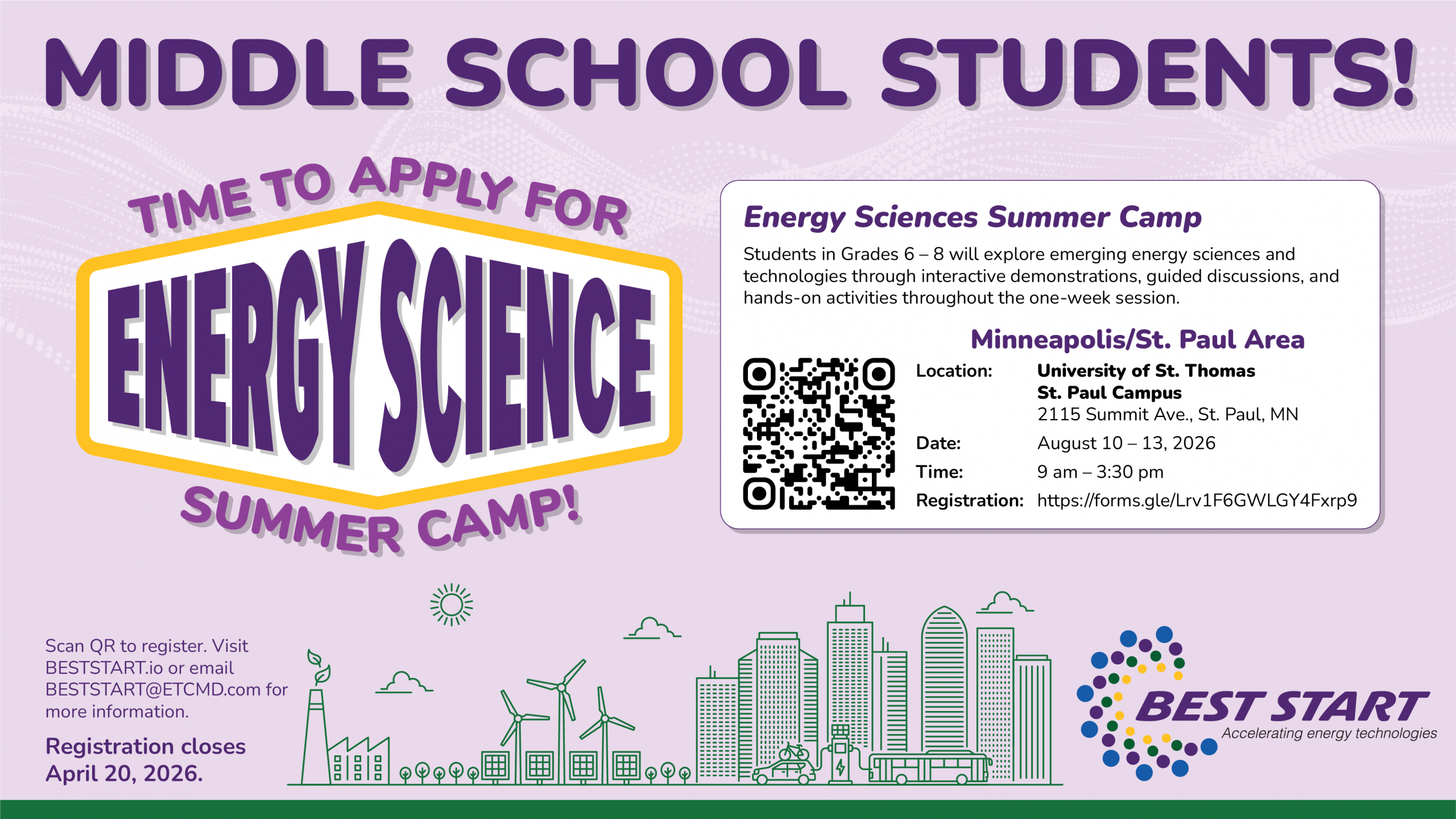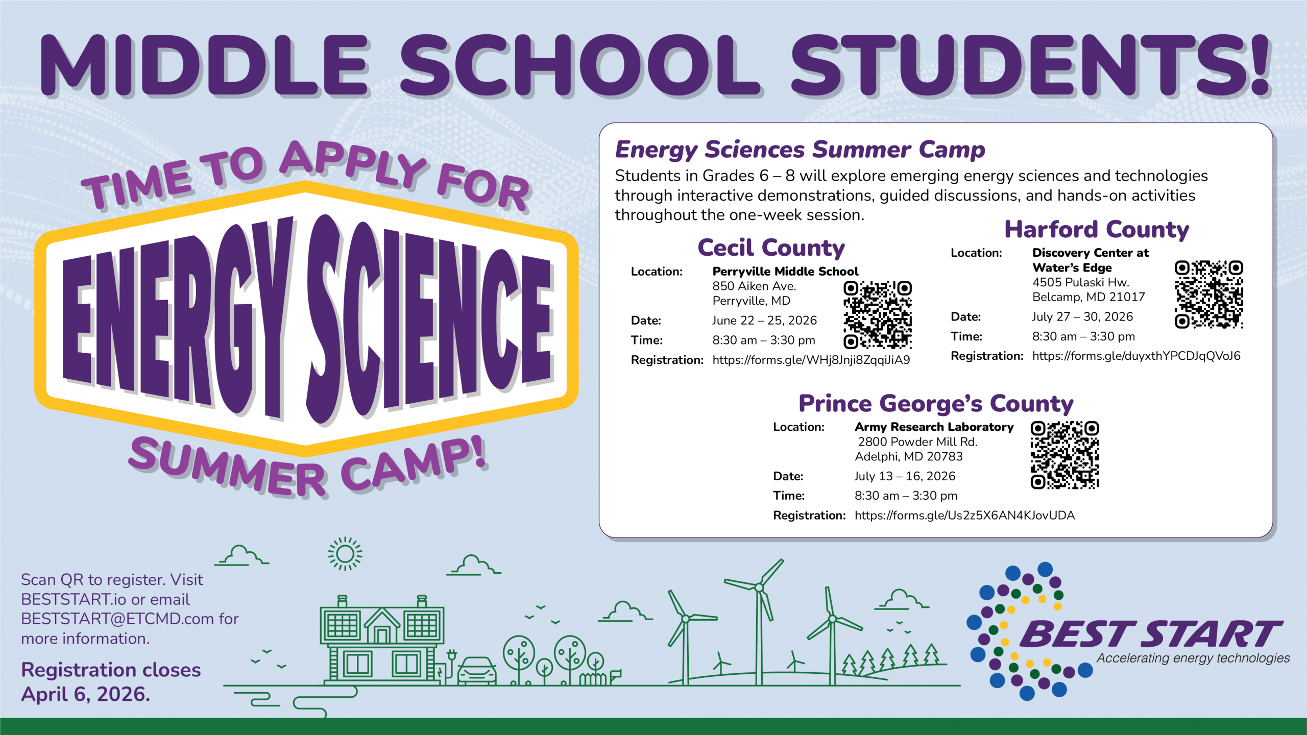 Welcome to BEST START STEM—where middle school students discover the exciting world of emerging energy sciences and technologies that power our future. Through our one-week Energy Science Summer Camps, students entering grades 6–8 dive into hands-on activities, interactive demonstrations, and guided discussions designed to spark curiosity, build critical thinking, and inspire the next generation of innovators. Aligned with our mission to accelerate resilient energy solutions for both civilian and military applications, these camps offer an accessible, engaging introduction to real-world energy challenges and opportunities—helping young minds see themselves as part of a stronger, more sustainable STEM workforce.